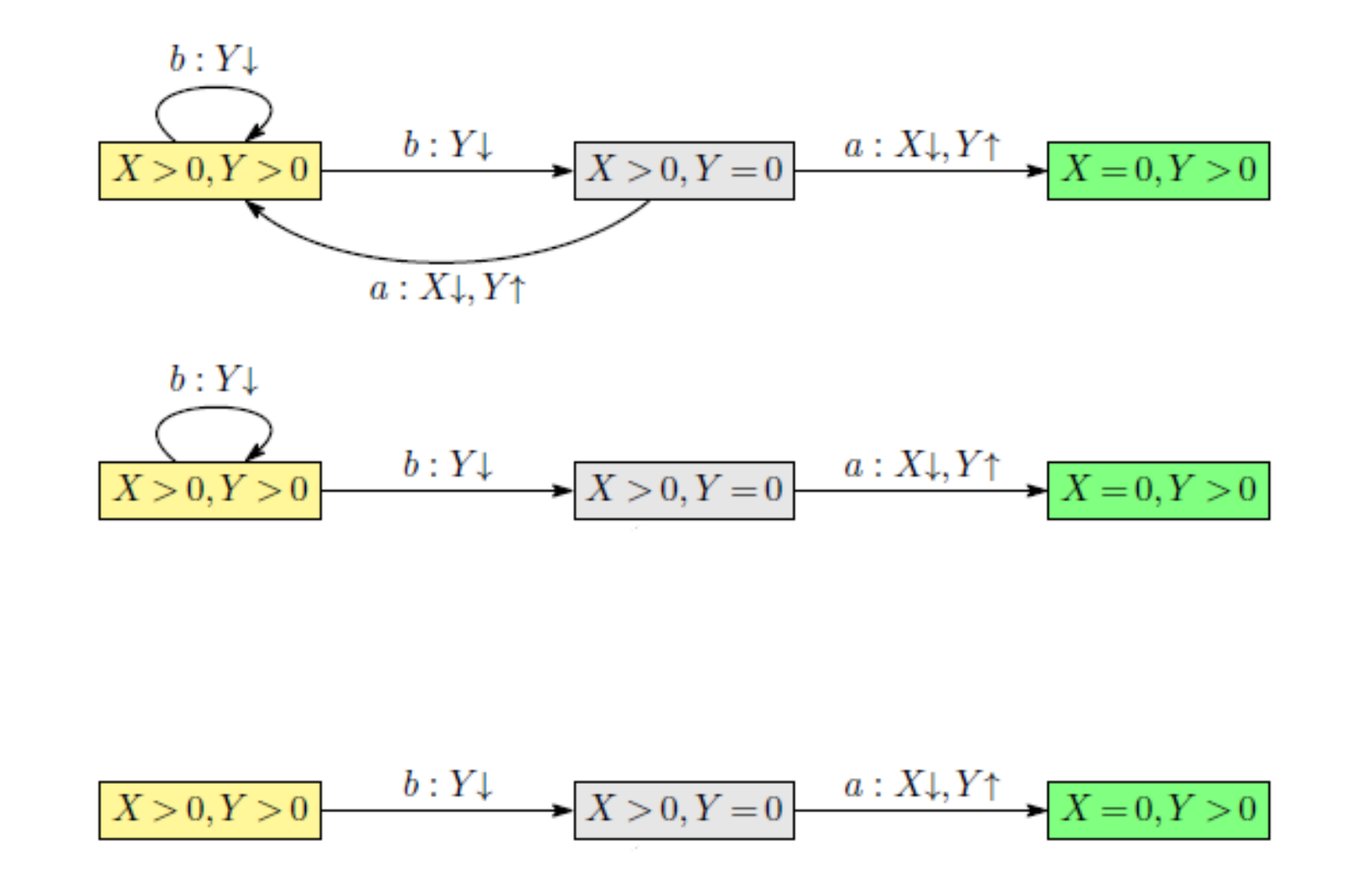 步骤: 1. 文字X=0和X>0写成数值变量X的eliminated,x=0表示\(P_X\)=0,而X>0表示\(\neg P_X\)=0,我理解是非零即真,这里当作一种标识True,认为建模目标令控制变量X=0 2. \(In_c(x)\)代表 确定性后续命题效果X>0,比如上图动作b箭头后续都是X>0; 3. \(Dec(x)\)代表 确定性后续命题效果X>0|X=0 ,即\(P_X=0 | \neg P_X=0\),还是上图,a为例子的话就是a箭头有可能指向X>0|X=0;