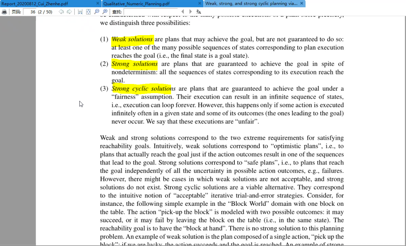 然后,测试由现成的FOND规划器获得的P的解是否**终止**。这最后一步是必需的,因为FOND问题P中的不确定性是unfair,但在条件上是fair:如果X的增加不超过有限数,则数值变量X的无穷定性减量最终使表达式X = 0成立。 (Bonet,De Giacomo,Geffner和Rubin,2017年)。